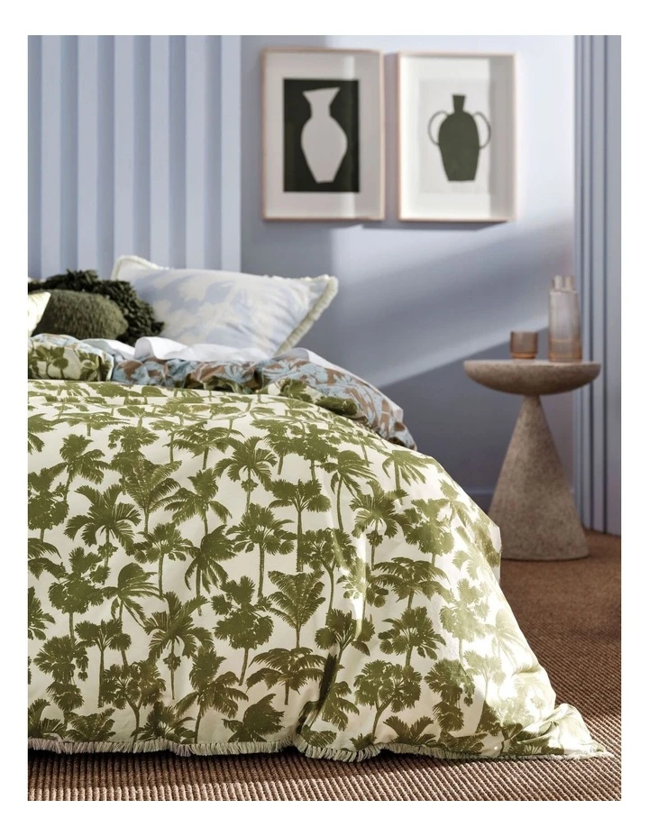 A sweet and stylish micro palm scene, the beauty of Tourelles is its reversible design from a leafy green to a sky blue and brown ground – perfect to accomodate your mood and style. This set, which is printed on a crisp cotton percale and trimmed with fringing, looks outstanding paired with its larger scale printed European pillowcases and matching cushions, all with matching trims.