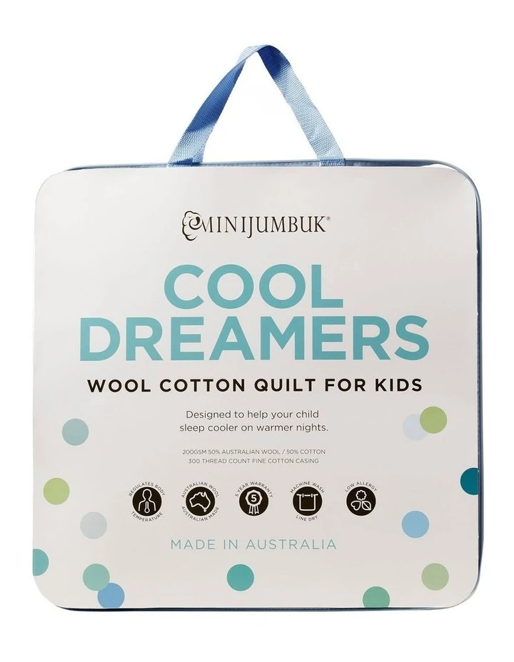 Weve designed our COOL DREAMERS Quilt with patented lightweight wool and cotton fill in a pure cotton casing. Cotton absorbs moisture and wool dissipates it away from your body. This unique combination aids the bodys natural cooling process, keeping your child comfortable during warm nights.