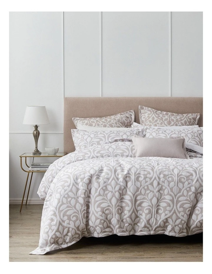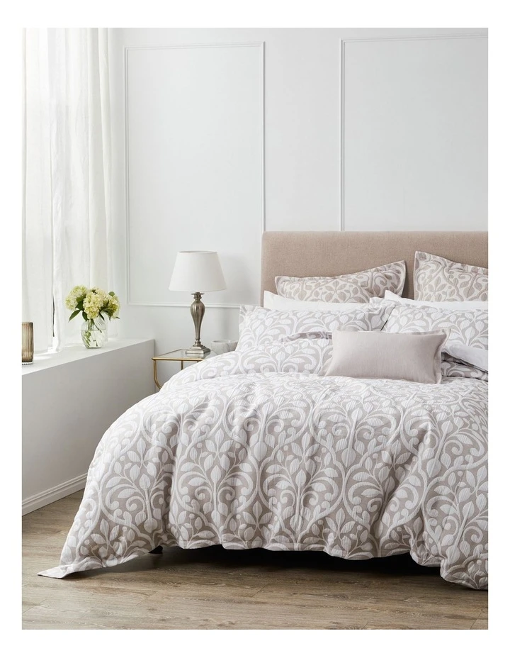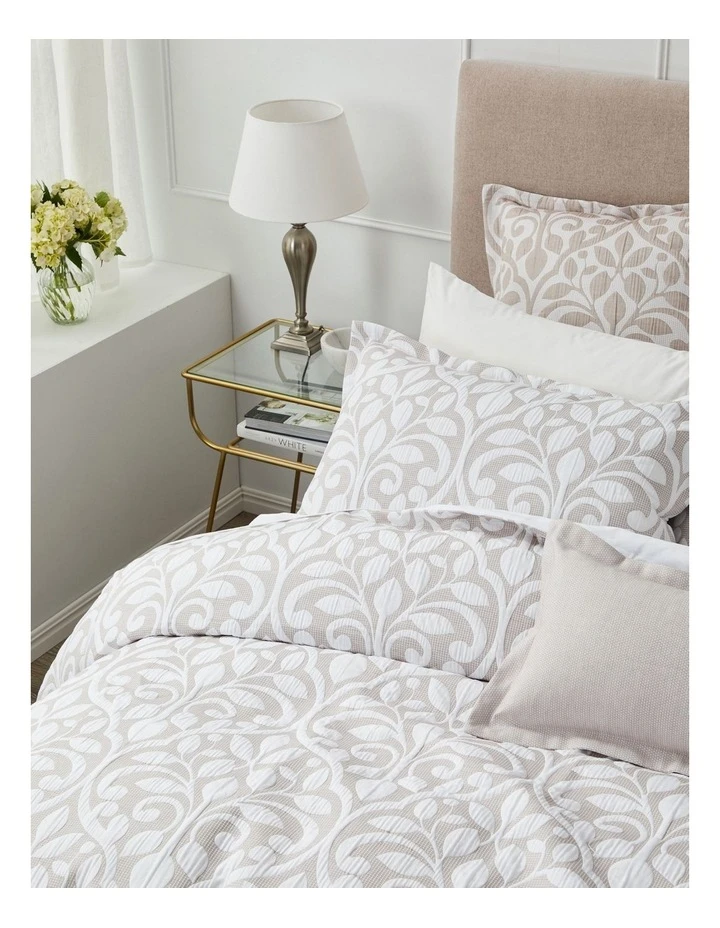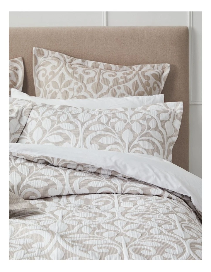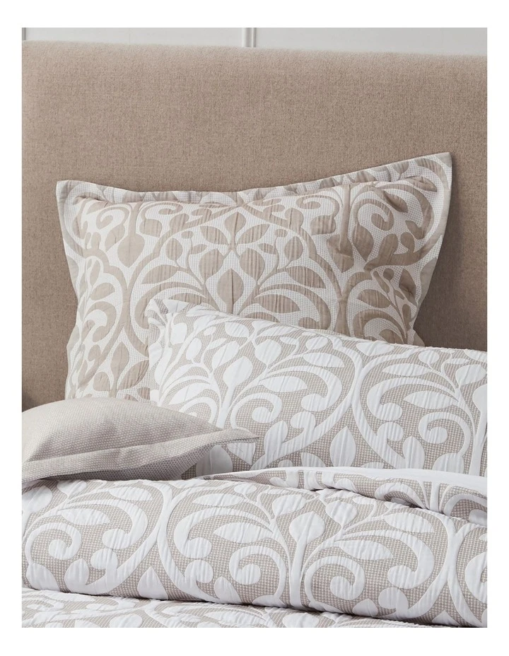 Marina Linen uses an interplay of patterns and textures to tell a story. Large scale floral emblems in white are lightly quilted for downy soft texture, set against a woven linen and white ground with subtle check pattern. Edges are neatly tailored with a self-flange.