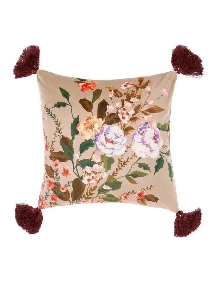 Decadently and deeply romantic, Cecilia exudes vintage style with its hand painted floral in saturated hues of lilac, brandy and terracotta, printed onto a black velvet ground. Elevate this showstopping ensemble with its matching quilted European pillowcases and velvet printed cushion with tassels for added sophistication.