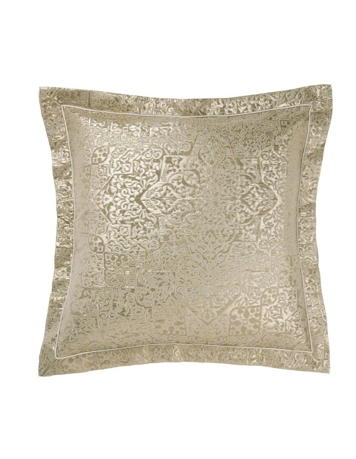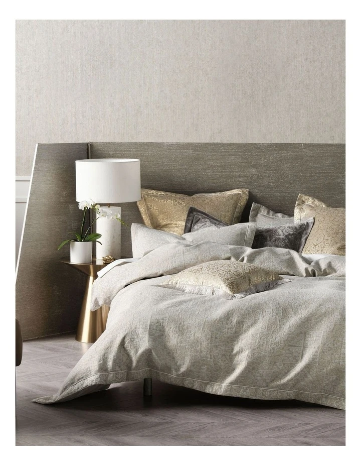 A perfect pairing of linen and silver tones, Izora enjoys a metallic thread of striking gold woven woven throughout its intricate Persian patterns. Trimmed with tailored edges, this master bedroom belle looks marvellous with its coordinating European pillowcases and jacqard cushion.
