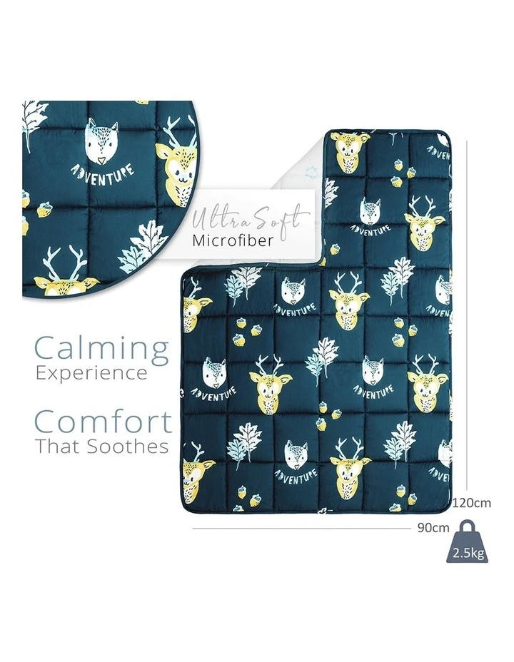 It looks like fun and feels like a hug. Our navy blue adventure blanket is perfect for the adventurous child. Featuring our cute yellow deer and cheeky fox on a navy blue background, your child will love this calming and fun design. This blanket has a contrasting light blue reverse side with antler pattern to complement your child’s bedroom. Designed to hug the contours of your childs body, weight is applied using odour free, glass microbeads which have been securely stitched into, and evenly distributed across each quilted pocket.