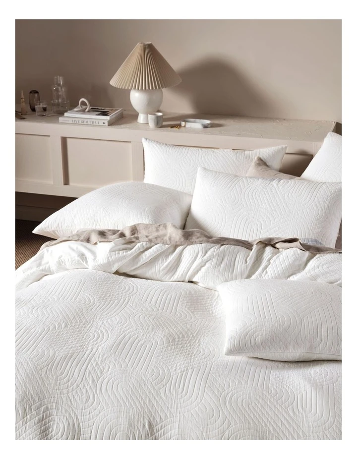 This fresh and super-cosy sugar set, which will transform your bedroom into a sanctuary, looks sublime indulged with its matching European pillowcases and cushion along with soft, textural accessories for a cocoon-like setting.