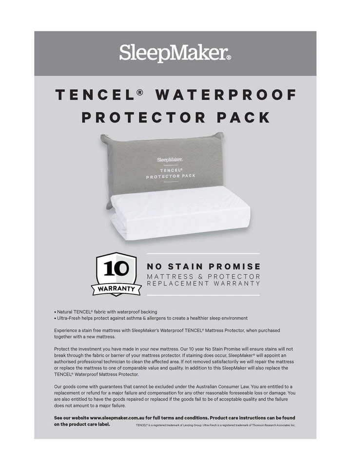PLUS** Experience a stain free mattress with SleepMaker’s Tencel Waterproof Protector, when purchased together with a new mattress. Our 10 year No Stain Promise ensures stains will not break through the fabric or barrier of your SleepMaker mattress protector.