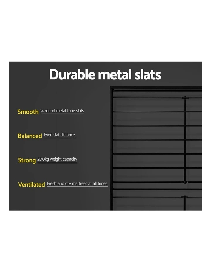 Sleek and elegantly finished in black. Our Sol Bed Frame is truly a stylish addition to any bedroom. Simple in design, the bed frame is constructed in sturdy steel for durability and strength. The black powder-coating lends a sophisticated yet neutral look that will go well with any room dcor. Across the frame, evenly spaced metal tube supports provide good weight distribution as well as ensuring that the mattress stays in place even with every twist and turn of your sleep. Underneath, central support beams further steady the bed under robust use. Not least, you will also find plenty of storage space underneath the bed for those who are space-challenged with their bedrooms. Designed to fit standard size mattresses effortlessly, our metal bed frame is guaranteed to give you pleasant dreams with every sleep.