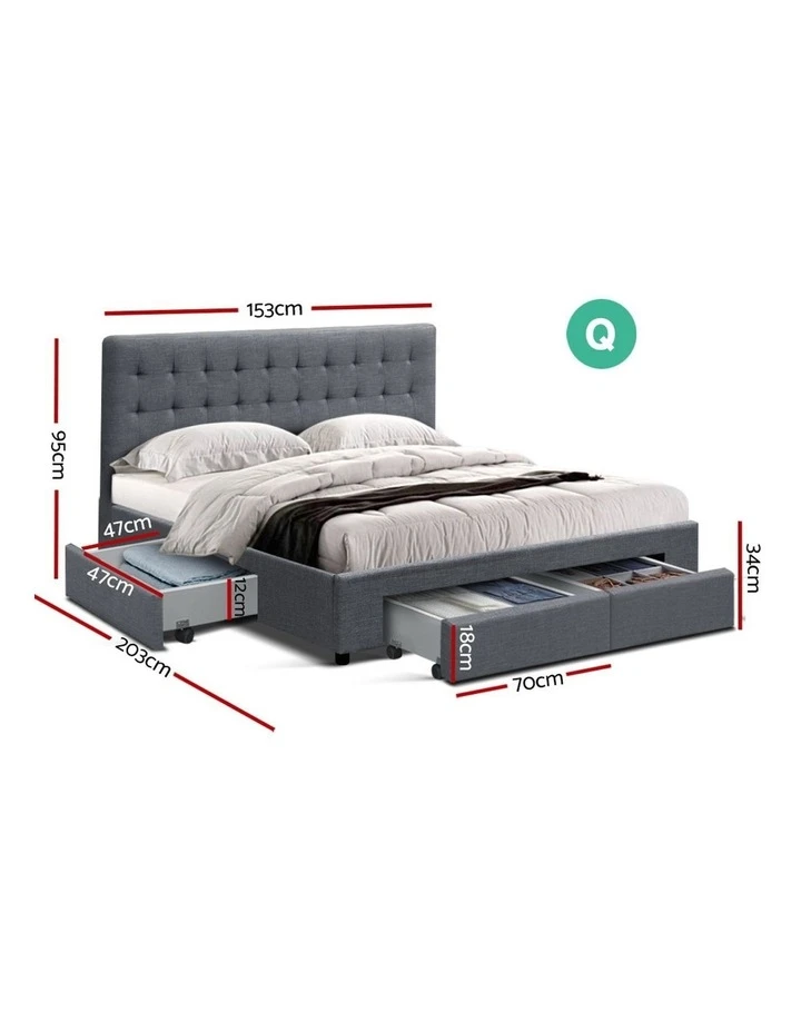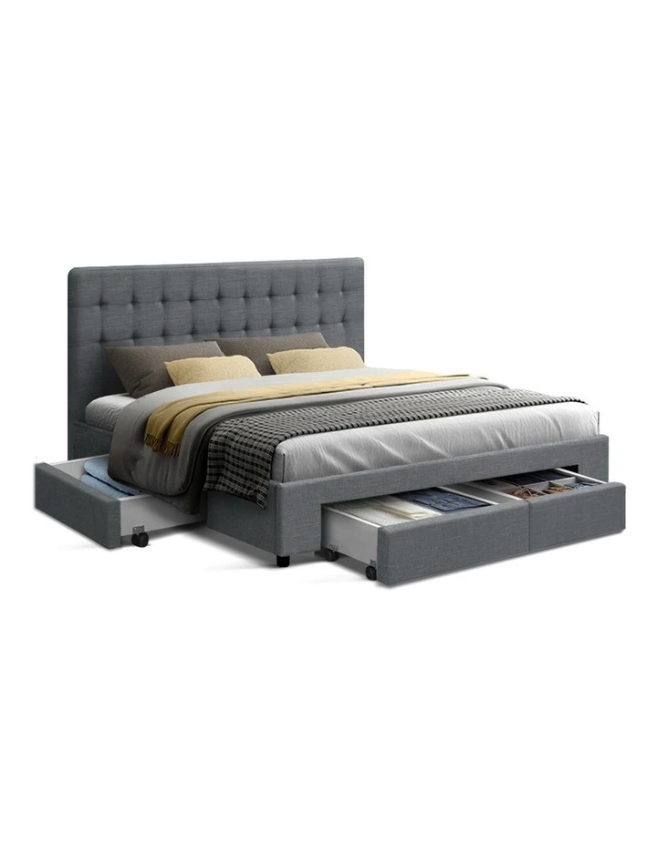 Of particular interest is the tufted headboard that really gives the Bed Frame a designer-class status. Simply oozing with elegance and sophistication in every detail. What’s more, underneath the Bed Frame, you’ll find four spacious drawers to store all your seasonal beddings and linen and a host of other personal essentials. No more clutter and loads of useable storage right under you. Better still, the drawers are set on wheels for easy access sliding in and out.