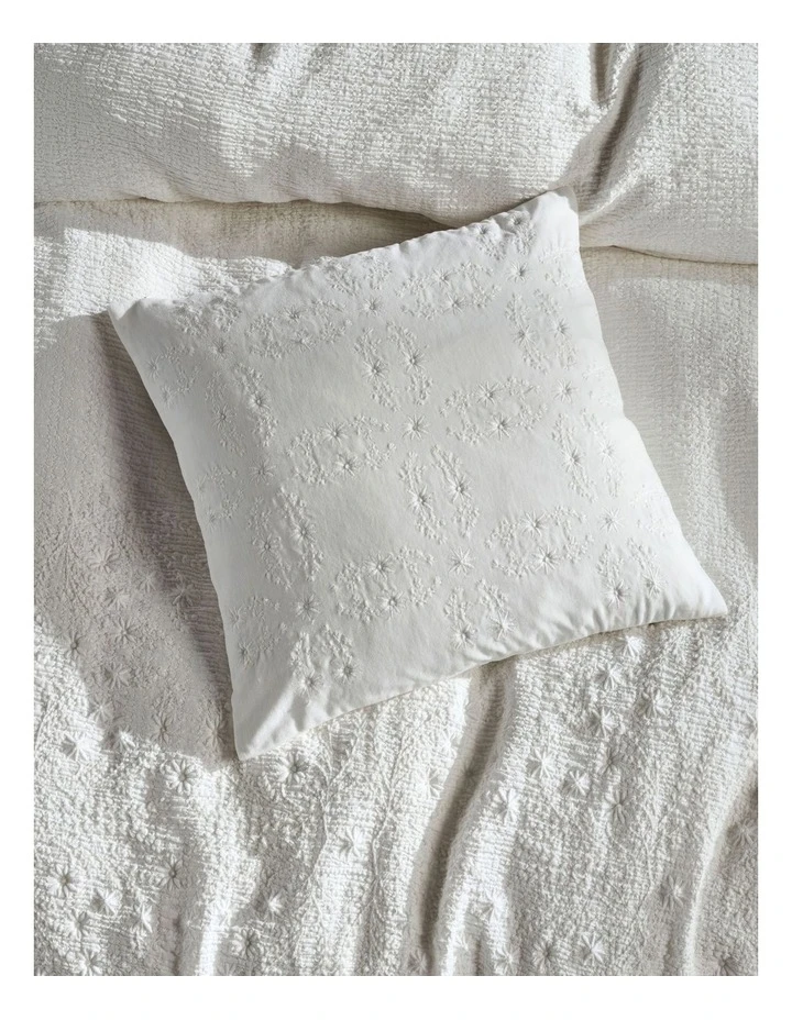Every bit vintage with its textured cotton, Abigail is a delicately embroidered and stone washed beauty that caters to every diehard romantic. Ties closures add to this alluring, all white theme, which looks ravishing with its matching embroidered European pillowcases and cushion in cotton velvet.