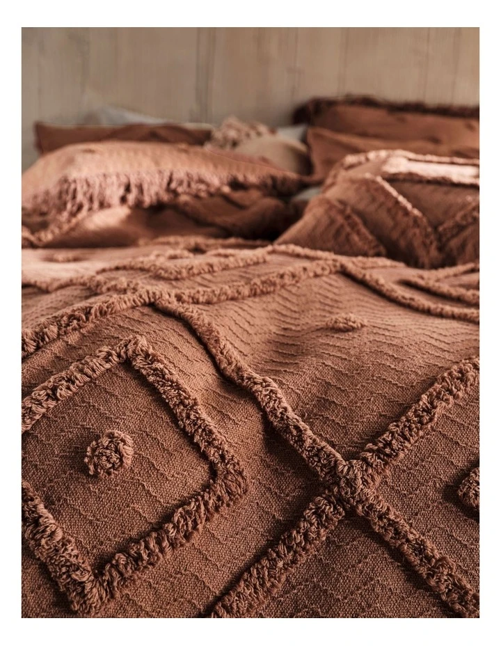 Adorn this eye-catching set with its coordinating European pillowcases with cute, knotted cotton fringing as well as our matching cushions for a Bohemian accent.