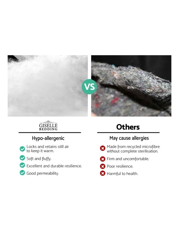 Having a good nights sleep is more than just having a great mattress. You need equally great pillows too. And our Giselle Bedding King Size Polyester Pillow is guaranteed to give you better sleep in more ways than one. First of all, the larger king size means the pillow provides better support all around, especially if you like to lean on the bedhead and do a bit of reading before you go to sleep. The polyester fibre filling is fluffy and soft, highly breathable and sweat absorbent to allow for a comfortable sleep all night long. The set of four pillows comprises two medium pillows and two firm pillows to accommodate every sleeping position. The medium pillow is good for back sleepers while the firm pillow suits side sleepers. Every pillow is housed in a 100% cotton cover that is soft to the touch and skin friendly. Perfect for your home or in commercial settings such as a hotel or Airbnb, our polyester fibre-filled pillow absolutely deserves a prime sleeping spot in any luxurious rest.