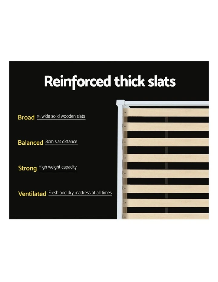 Strong and sturdy, the Bed Frame comes with a durable plywood slated base, reinforced angled brackets for long term support, stylish headboard, heavy-duty steel fixings and smooth edges all round. Finished in a non-toxic, eco-friendly white paint, the neutral-coloured Bed Frame makes for easy dcor coordination with any bedroom. Better still, the Bed Frame also has ample space below to fit in a pair of optional trundle drawers for extra storage of bedding essentials.