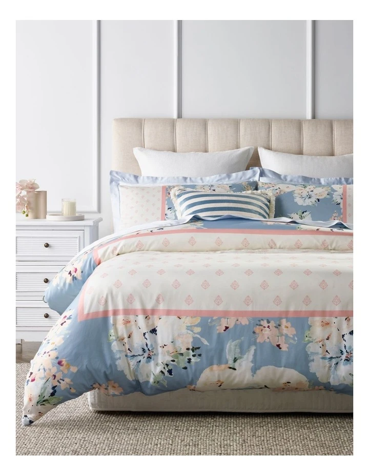 Bring a slice of chateau with the Isabeau quilt cover. Designed in Australia, this quilt cover features a damask pattern inset bordered with handprinted printed floral clusters, creating a light sense of romance with a touch of regency. Made with 300TC cotton sateen, this quilt cover brings a beautiful smooth hand feel and an understated luster that adds a dash of glimmer.