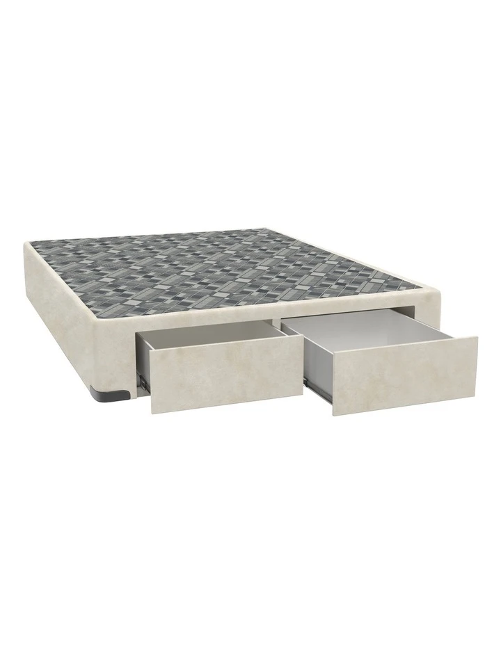 Champagne Velvet Base with Foot End Drawers comes with Headboard Bracket Attachment. All wood construction using a composite of Kiln dried Australian plantation pine and engineered plywood. Each frame is meticulously hand assembled with fully glued joints to ensure it stands the test of time. Traditional upholstery techniques are applied by our team of qualified tradesmen, delivering a hand tailored piece of furniture of exceptional quality and timeless appeal.