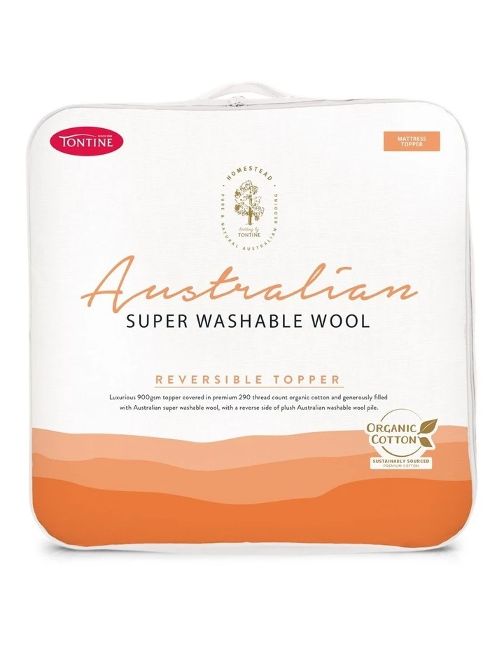 The Homestead Reversible Super Washable Wool/Organic Cotton Mattress Topper features a plush Australian super washable wool pile on one side making it ideal for the colder winter months, & a quilted Australian super washable wool filled reverse for year round use.