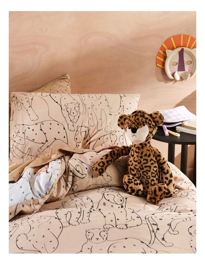 Rawrrrrrr!! Everyone’s favourite, the big cats come to life in this thrilling print on cotton percale. Illustrated with crayon in a contemporary style and colour palette, this striking set is trimmed with cord piping and is fully reversible to your little cub’s delight.