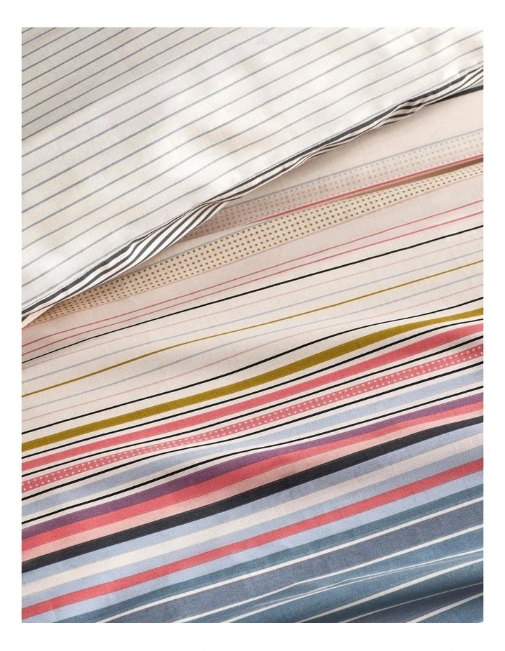 Inspired by vintage textiles, Sheridan’s Raye European pillowcase refreshes the classic stripe for a youthful look. Contrasting colours and sizes make a visual impact, small scale spot patterns add to the juxtaposition. Cotton sateen, small scale pinstripes feature on the reverse. – 100% printed cotton sateen – Multi- coloured, multi- sized stripes – Contrast printed reverse, in small scale pinstripe – Inspired by vintage textiles