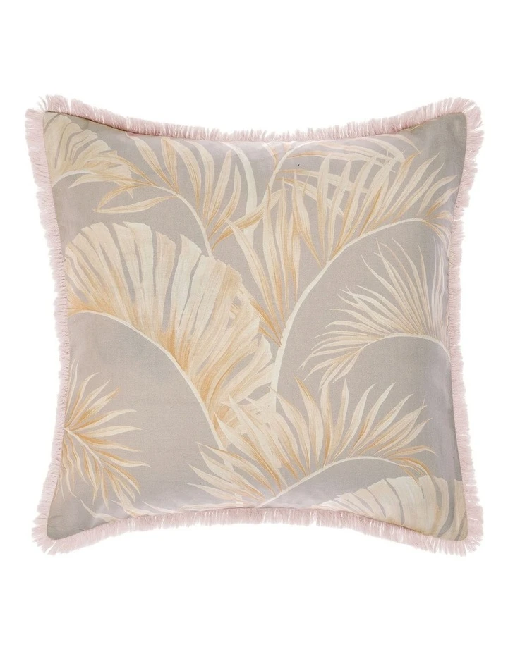 Beautifully hand painted, Kalani’s printed palm design on textured cotton is fully reversible, allowing you to choose between a fresh blue-green palette or one that’s neutral in a peach-grey combination. This set will transport you to the tropics adorned with its coordinating fringed European pillowcases and its lopped, tufted and tasseled cushion, giving your bedroom a relaxed coastal vibe.