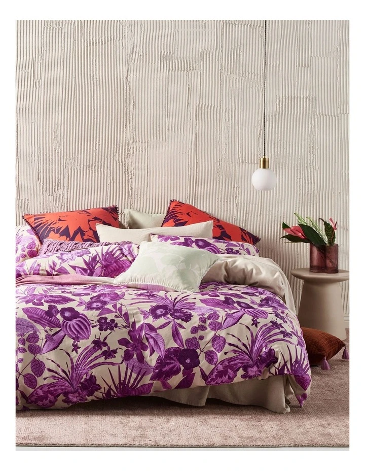 A captivating floral in berry and intense purple, Nirvana challenges boundaries between classic and ultra-modern design. This cotton sateen print, which reverses to a plain-dyed natural hue, will inject a worldly and deeply calming style into your boudoir.
