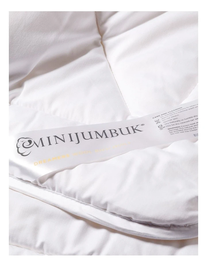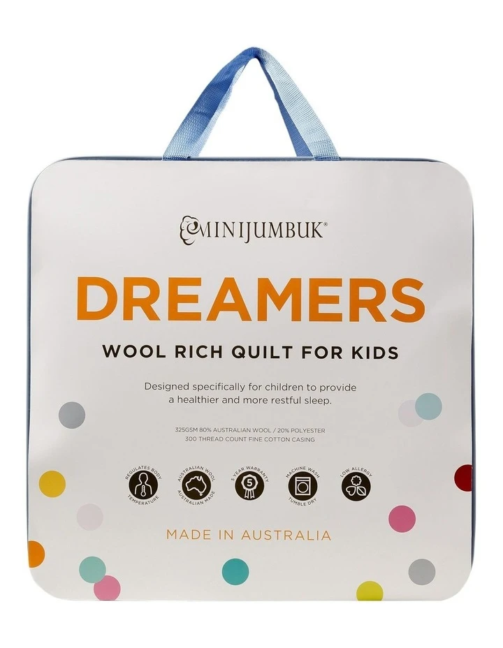 Weve designed our DREAMERS Quilt with a mid-weight fill of 325gsm and pure cotton casing to gently balance your childs temperature throughout the night. Weve also added just the right amount of spiral man-made fibre to enhance the loft and made this quilt even easier to wash, without sacrificing the natural benefits of wool.