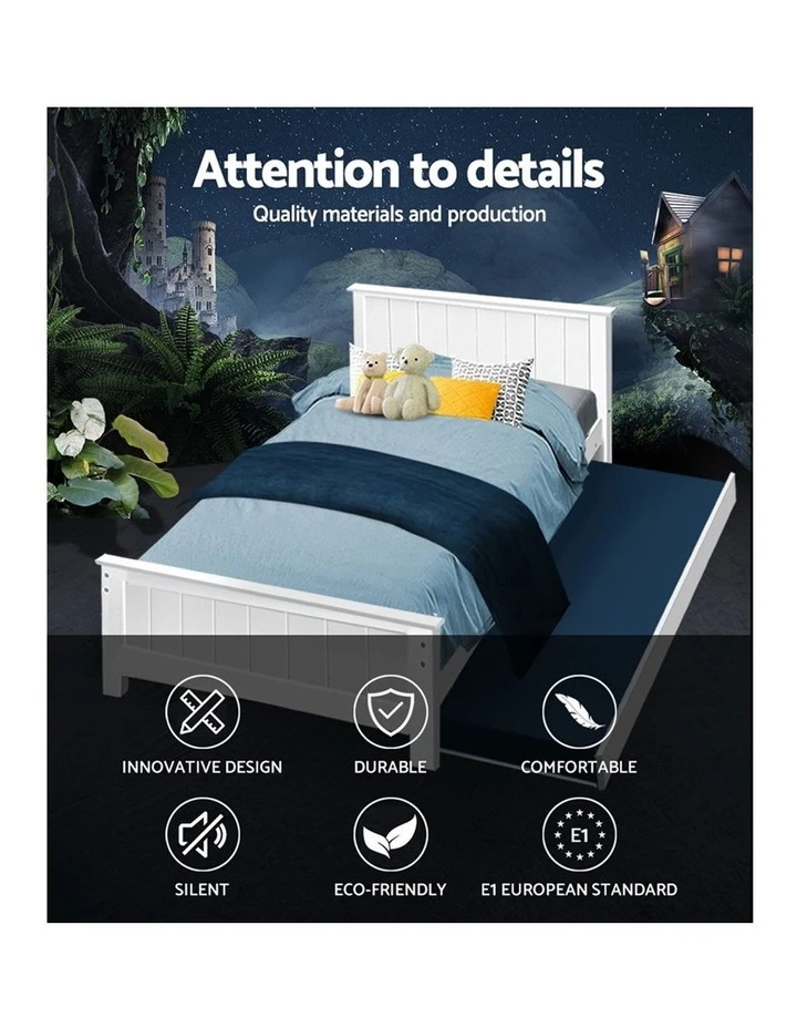 Sometimes finding the space to store a spare bed can be a hassle if your home is already a full house. And when friends and relatives drop by to spend a night or two, it can be a real dilemma getting them an extra bed. Well, not if you have our Artiss Elvis Trundle Bed. When not in use, the spare bed is stored under the normal bed. Comes the time to use it, just slide it out on either side and the extra bed is ready to welcome your weary guest. Both bed frames are made of solid pine wood with quality timber slats to spread the weight evenly. Not least, the bed frames are designed to fit Australian king single-sized mattresses with minimum hassle.
