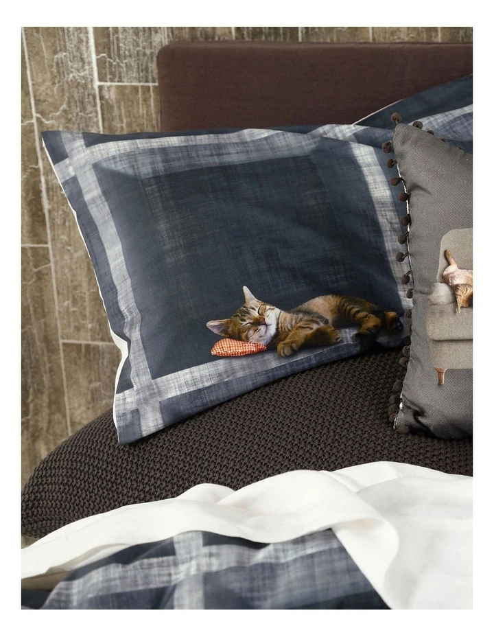 All curled up for a good night’s sleep, Cubby’s super-charming digital print enjoys cats and kittens relaxing in their cubbies. Made from 250 thread cotton percale, this blue and grey geometric will create some feline fun and looks even more thrilling paired with its coordinating cushion.
